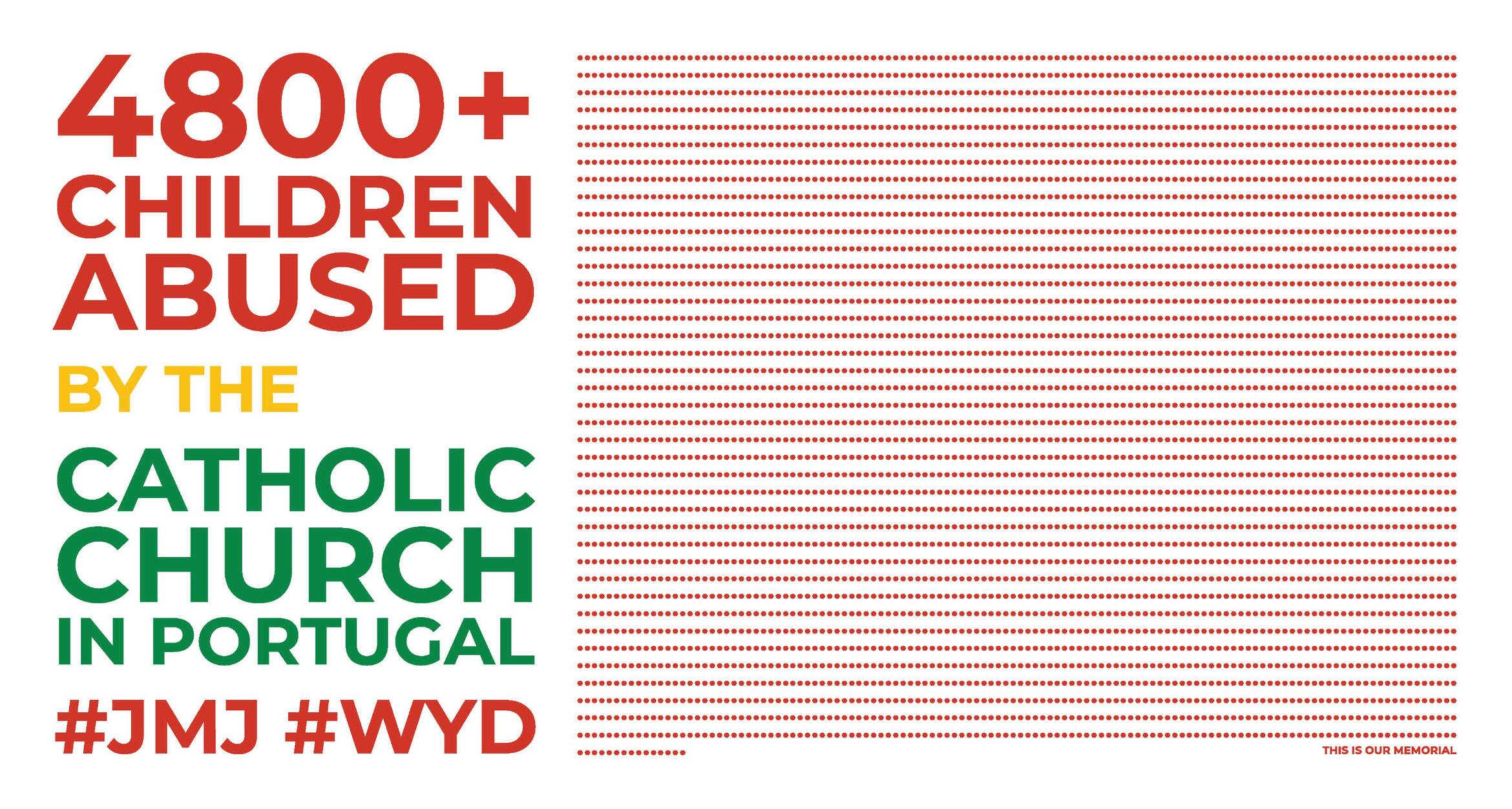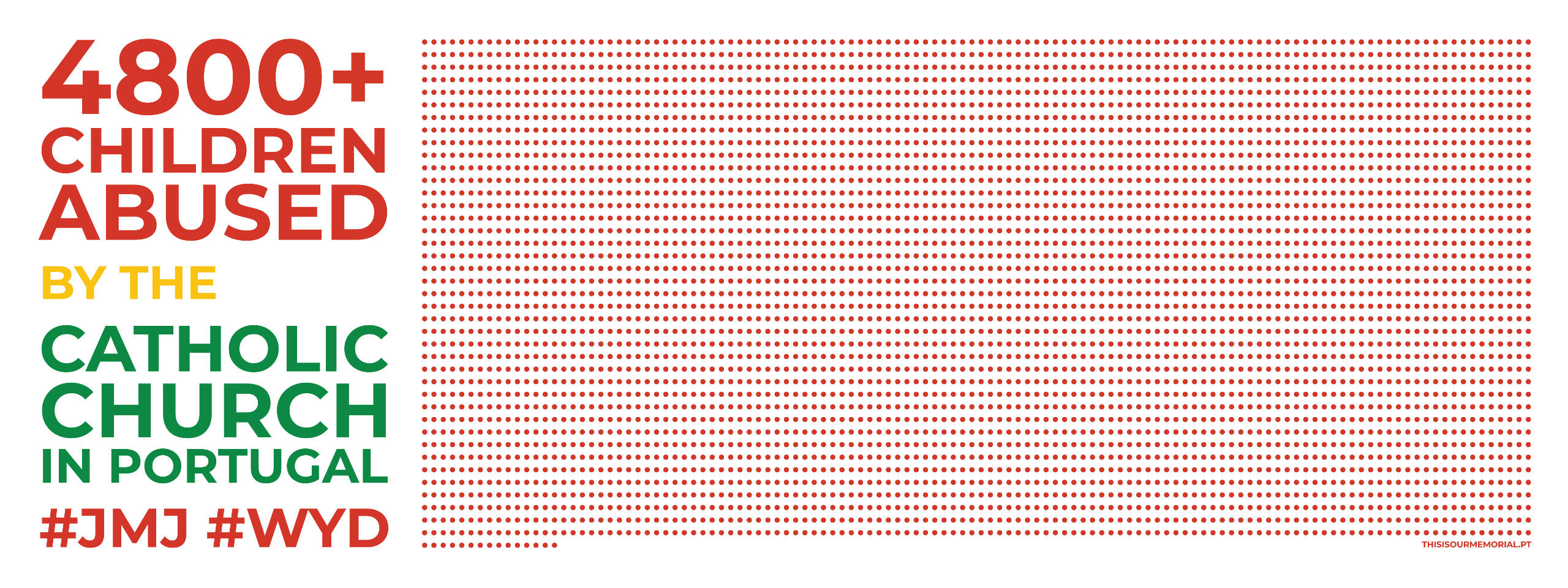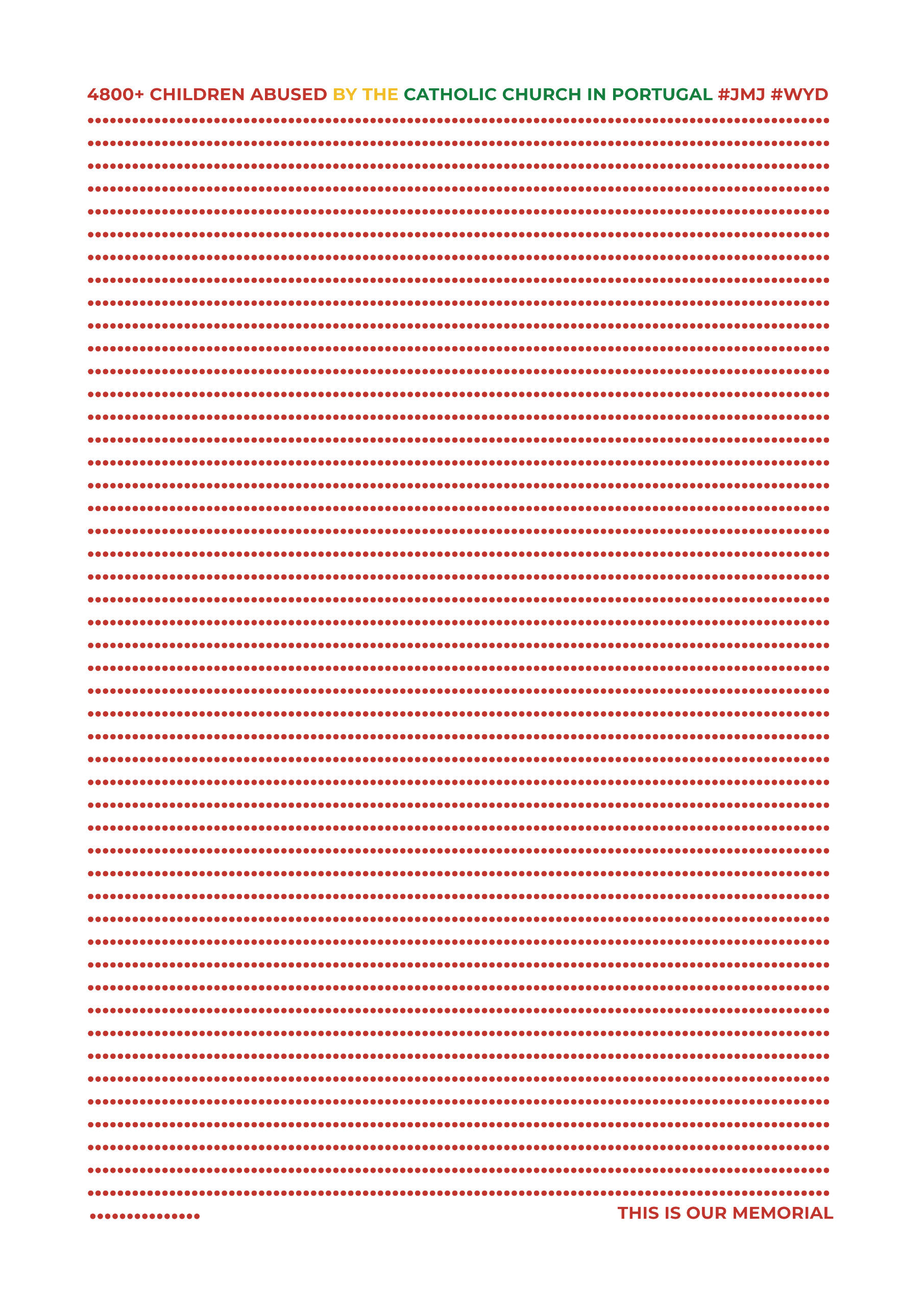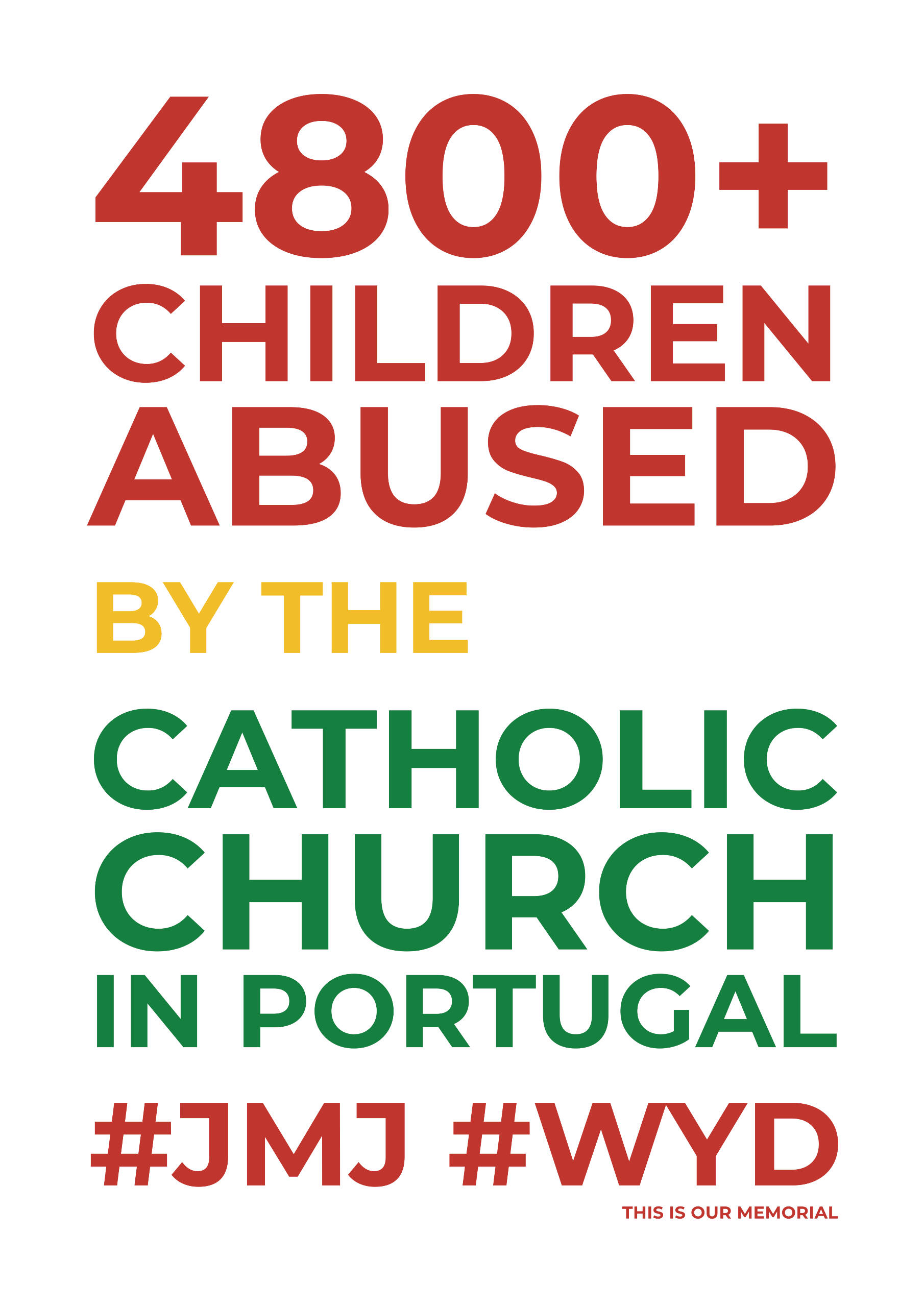 Tudo começou com o design de um cartaz e a ideia de o instalar em três outdoors pelos concelhos de Lisboa, Oeiras e Loures, como memorial para as vítimas de abuso na Igreja Católica em Portugal.Duas angariações de fundos na plataforma de financiamento cooperativo PPL (e alguns donativos individuais extra plataforma) depois, onde 295 participantes nos confiaram 3021€, arregaçámos as mangas e fomos ao trabalho.